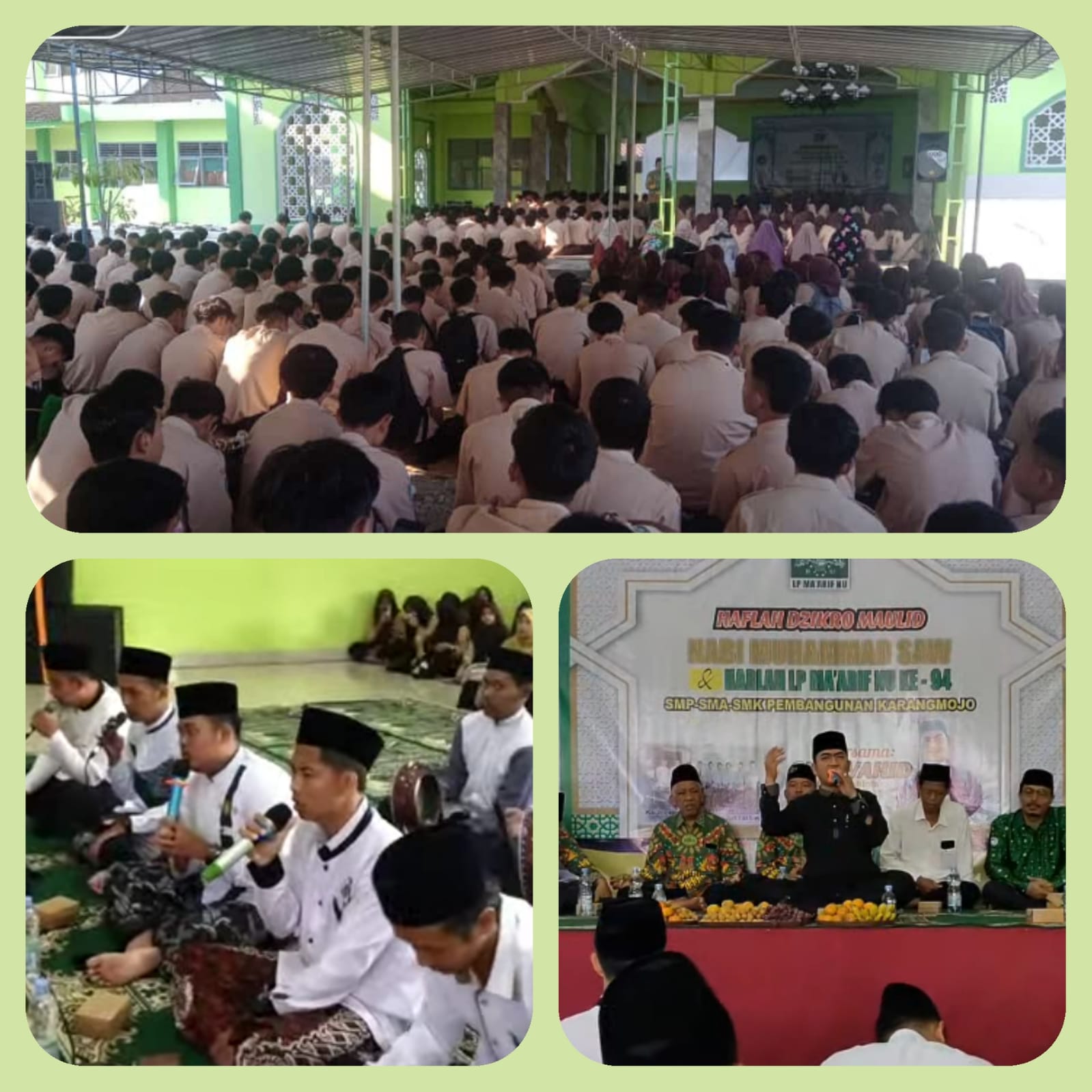Sholawat Nabi bergema di Masjid At-Tarbiyah Sekolah Terpadu Pembangunan Karangmojo, Jumat pagi (29/9), sekitar 700 jamaah yang berasal dari keluarga besar SMP, SMA, dan SMK Pembangunan Karangmojo bertumpah ruah memenuhi area masjid. Pada hari tersebut diselenggarakan Acara Peringatan Maulidunnabi Muhammad SAW. Dalam acara tersebut hadir Dai kondang Gunungkidul, Wahid Syaifudin Ahmad atau yang lebih dikenal dengan Gus Wahid. Siswa sangat antusias ketika menyambut Gus Wahid .....